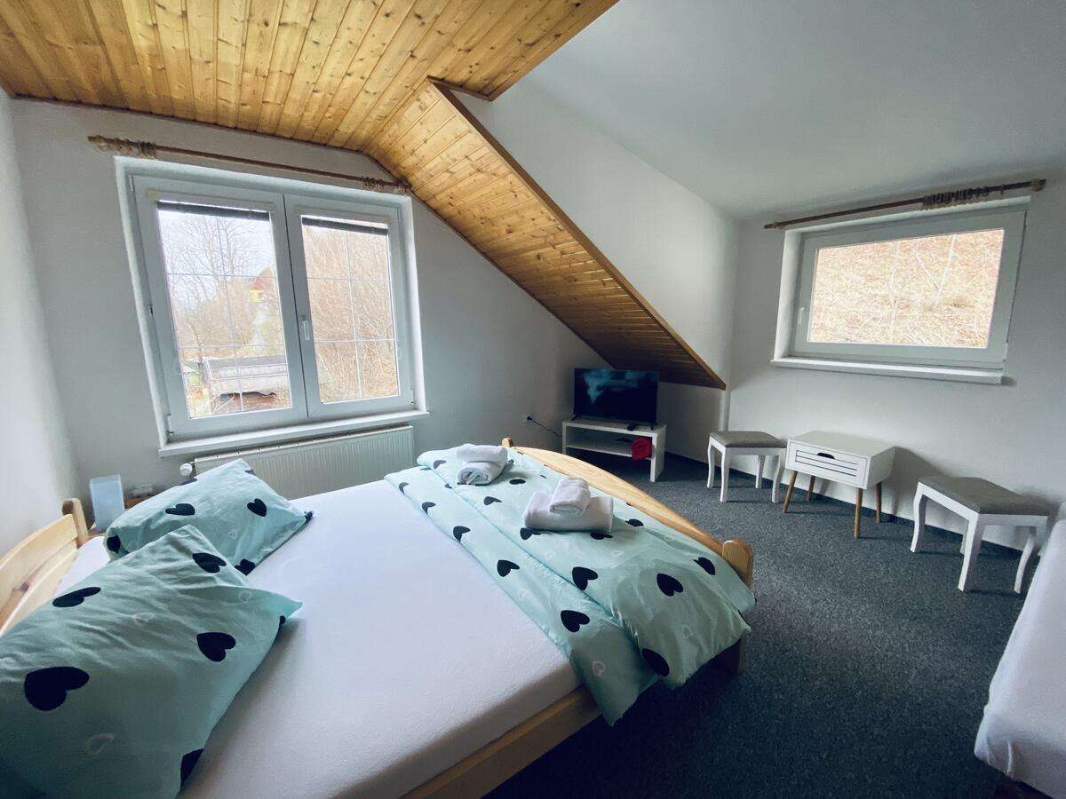 Třílůžkový pokoj Od 1690 Kč / noc Velikost: 15 m2 | Počet hostů: 3 V pokoji lze za poplatek využít dětskou postýlku (přistýlku), takže perfektně vyhovuje i mladým rodinám. Každý z hostů ma ,,nonstop,, přístup do jídelny ( společ. místnosti ), ve které je plně vybavená kuchyň, rychlovarná konvice,mikrovlná trouba, vestávná trouba a lednice. Zároveň penzion disponuje prostornou zahradou s dětským hřištěm, bazénem, grilem. Najdete také několik míst k posezení. Vše je pro pouze pro Vás ,,hosté penzionu,, |
